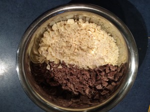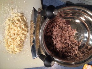 Während die Schokolade schmilzt kann man schon mal die Vollmilchschokolade und die weiße Schokolade zerhacken.