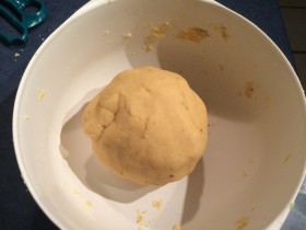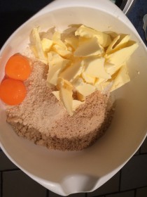 Mehl, Zucker, Mandeln, Haselnüsse und die Prise Salz in einer Schüssel vermengen. Die Eigelb und die klein geschnittene Butter dazu geben und zu einem homogenen Teig kneten.