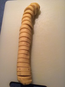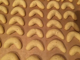 Nach der Ruhephase die Rollen in dünne Scheiben schneiden und aus den Teigtalern mit den Händen die Kipferl formen und auf das Backblech legen.