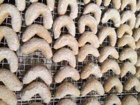 Für ca. 10 Minuten bei 180°C in den Ofen geben. Immer mal wieder kontrollieren, damit die Kipferl nicht anfangen braun zu werden. Eventuell die Temperatur herunterfahren oder die Backzeit verkürzen. Auf dem Blech ca. 2 Minuten abkühlen lassen – dann in der Puderzucker-Vanillezucker-Mischung wälzen und auf einem Gitter komplett auskühlen lassen.