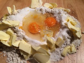 Alle Zutaten für den Mürbeteig – Mehl (Typ 1050) Butter Zucker Eier Vanillezucker Zitronenabrieb – in einer Schüssel schnell zu einem Mürbeteig verarbeiten und in Folie gepackt mindestens eine Stunde im Kühlschrank ruhen lassen.