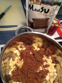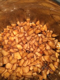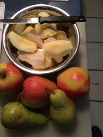 Zuerst der fruchtige Anteil. Hierzu Äpfel und Birnen schälen und klein schneiden bis ihr ca. 300 gr. habt. In einem Topf bei kleiner Hitze mit dem Zucker (oder Muscovadozucker) und dem Saft einer Zitrone leicht zum köcheln bringen. Nach etwa 10 Minuten einen halben Teelöffel Zimt hinzu und verrühren. Zum Schluss noch einen Esslöffel Speisestärke und runter von der Hitze. Beiseite stellen und abkühlen lassen.