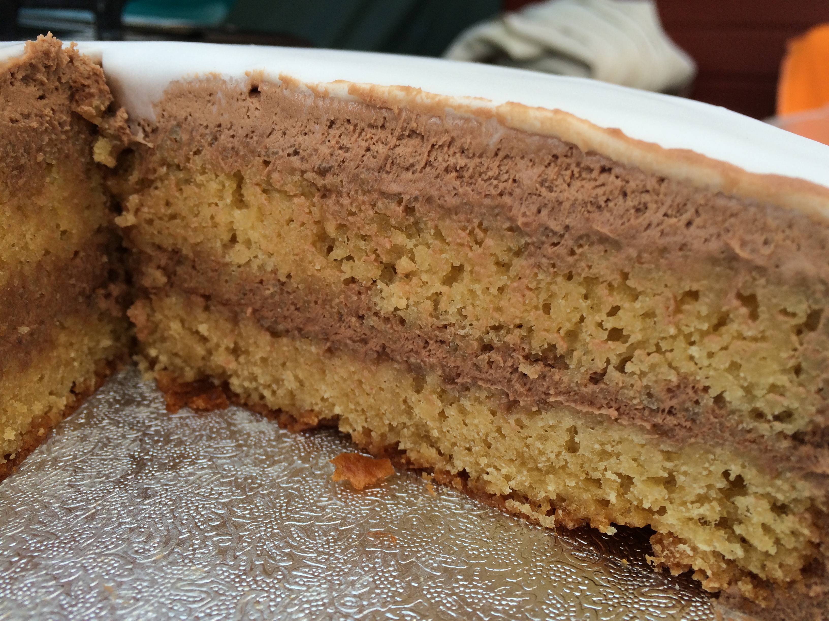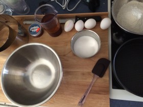 Freitag Morgen – FREI – schon mal ein toller Start in den Tag. Kein Wecker, der um 05:50 Uhr klingelt. Und dann um 05:55 Uhr nochmal – und um 06:00 Uhr nochmal bis ich mich letzten Endes aus dem Bett schäle. Ich kann mir alle Zeit der Welt lassen und freue mich schon aufs Backen. Allerdings sitze ich mit einer heißen Tasse Kaffee vor drei Rezepten und kann mich nicht entscheiden. Dann rufe ich mir die Torte nochmal in Erinnerung, bei der mir die Ganache nicht so 100%ig geschmeckt hat. Oder backe ich alle drei Rezepte? Nein – wer soll das dann alles essen – nö – eine Torte und die perfekt – das muss reichen. Die Entscheidung fiel dann auf das schon bekannte Rezept des Vanillekuchens – doch wollte ich dieses Mal eine Vollmilchschokolanden-Ganache. Also ran an die Schüsseln und Rührwerkzeuge. Für eine 24er Springform das einfache leckere Rezept, keine große Sache und der Kuchen war im Ofen. Das ist ein riesen Pluspunkt wenn ich daran denke, dass ich im Mai dann wahrscheinlich etwas mehr unter Zeitdruck stehe. Den restlichen Tag durfte ich dann in vollen Zügen genießen. Schließlich kühlt ein Kuchen von alleine aus. Das Leben kann so schön sein. Was aber von vornherein klar wurde war, dass ich nicht wie geplant den Boden zwei mal teile. Dazu war er mir nicht hoch genug und ich hatte einfach zu viel Respekt davor. Es sollte dieses Mal ja nicht daran scheitern, dass ich beim Aufschneiden den kompletten Kuchen zerstöre. Also war der Plan ein mal Teilen, schön füllen und mit Ganache einstreichen. Soweit mein Plan für den Samstag.