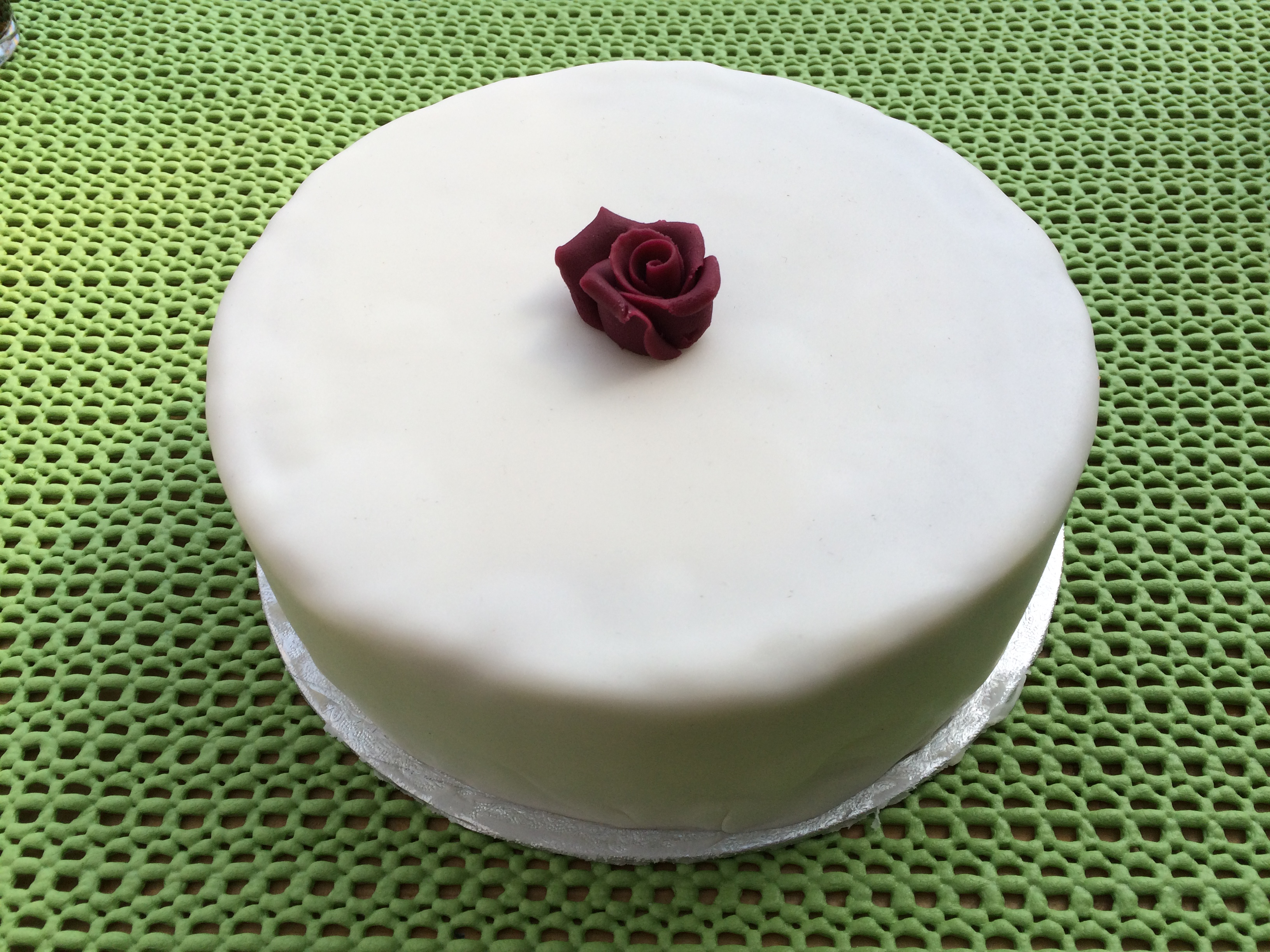 Und ich auch – ran an die Kuchenformen und frisch ans Werk. Und ja der nächste Versuch war super – perfekt – schmackhaft…und was das Beste daran ist – die Erkenntnis: mit Fondant zu arbeiten macht einen Riesenspaß. Das Ergebnis war ein etwas festerer Vanillekuchen mit einer Marmeladenschicht, weißer Ganache als Untergrund und überzogen mit Fondant. Er hat auch allen Testessern geschmeckt, wobei mich die weiße Ganache geschmacklich nicht so 100%ig überzeugt hat. Ihr könnt euch aber denken, dass mir der Geschmack erst einmal egal war – die Konsistenz (etwas fester und überhaupt nicht trocken) war meiner Meinung nach geeignet für den unteren Kuchen und vor allem das Überziehen mit Fondant hat geklappt. Das war mein Highlight. Eines muss ich noch zugeben – die kleine Torte war verdammt süß. Aber hey – ich kann Fondant 🙂