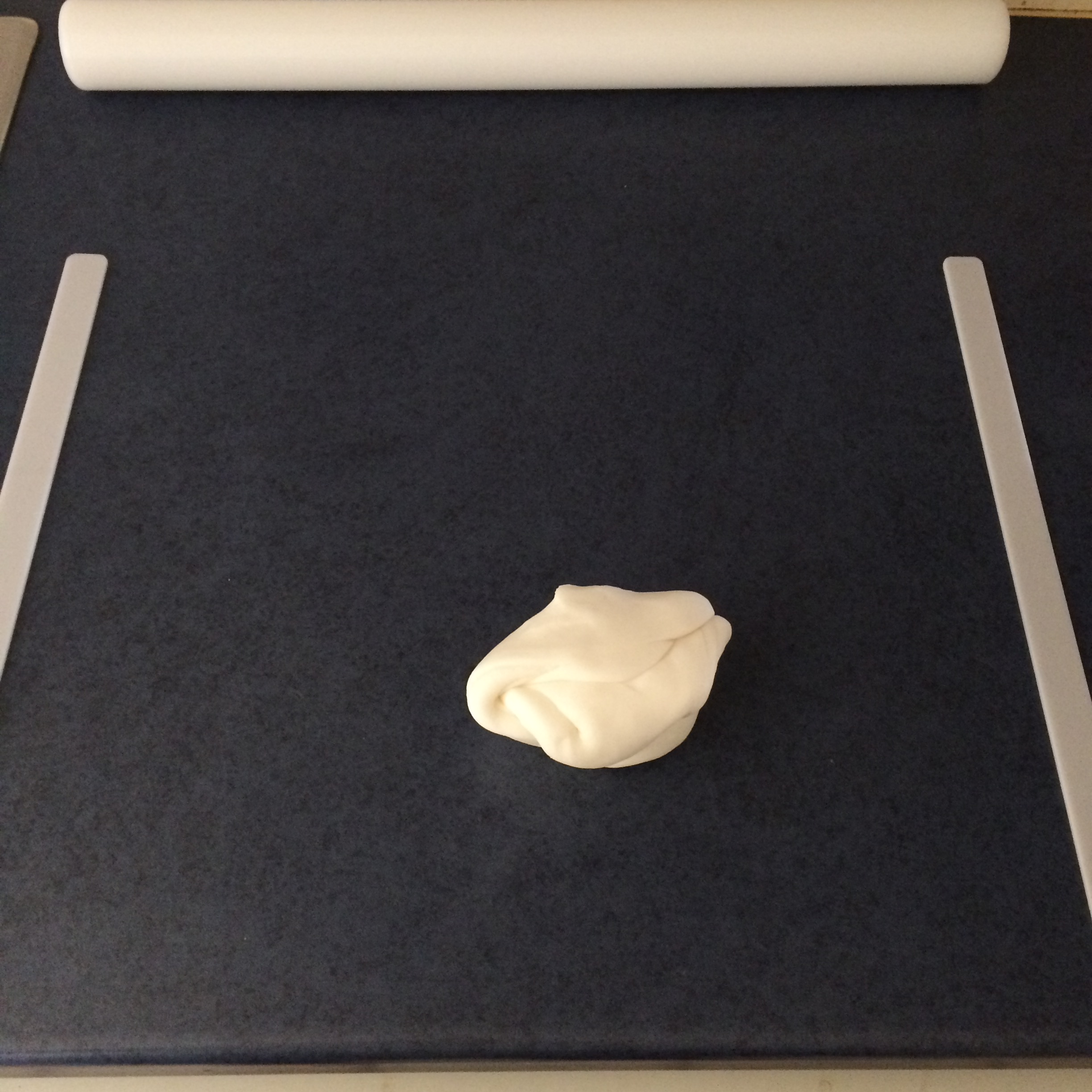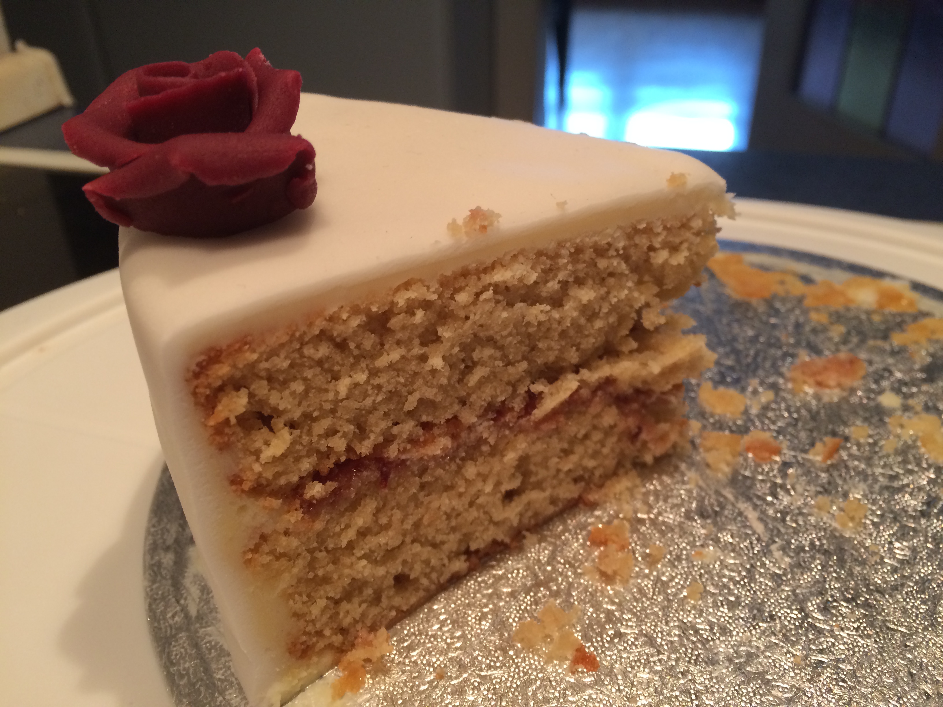 Der Kuchen hatte jetzt eine Nacht Zeit sich etwas zu setzen und schnittfester zu werden. Was dann auch wunderbar geklappt hat. Gefüllt habe ich ihn mit einer dünnen Marmeladeschicht und reichlich Ganache. Mit dieser habe ich ihn dann auch eingestrichen. Zurück in den Kühlschrank damit die Ganache auch fest werden kann. Die Zeit dazwischen wurde dann schön mit einer Sporteinheit und einem Nickerchen genutzt. Ich will ja schließlich auch was von dem langen arbeitsfreien Wochenende haben. Somit war der eingestrichene Kuchen dann ca. vier Stunden im Kühlschrank, was ausreichte um die Ganache fest genug für den Fondant werden zu lassen. Als ich das letzte Mal mit dem Fondant meine Premiere feierte gelang alles von Anfang an. Mich beschlich das Gefühl, dass das wohl Anfängerglück war und erinnerte mich an meine ersten Macarons. Auch hier war der erste Anlauf gelungen und der zweite ein Desaster. Darum ging ich hochkonzentriert ans Werk und legte alle Hilfsmittel akribisch bereit. Ausroller, Hilfsschienen, Stärke im kleinen feinen Sieb etc. Dann wog ich den Fondant ab – 400 gr. für diesen Kuchen reichten locker aus. Das Ausrollen lief besser als beim ersten Mal und ich ging auch mit etwas mehr Selbstvertrauen an die Sache ran. Ich will euch jetzt auch nicht auf die Folter spannen – es hat wunderbar geklappt. Das Ergebnis war eine 24cm Torte mit Schokoganache als Füllung und Untergrund für den Fondant. Geschmeckt hat sie den gleichen Testessern (und mir) besser als die vorherige mit der Ganache aus weißer Schokolade. Somit haben wir heute einen neuen Sieger in der Kategorie „Unterer Hochzeitstorten Kuchen„.