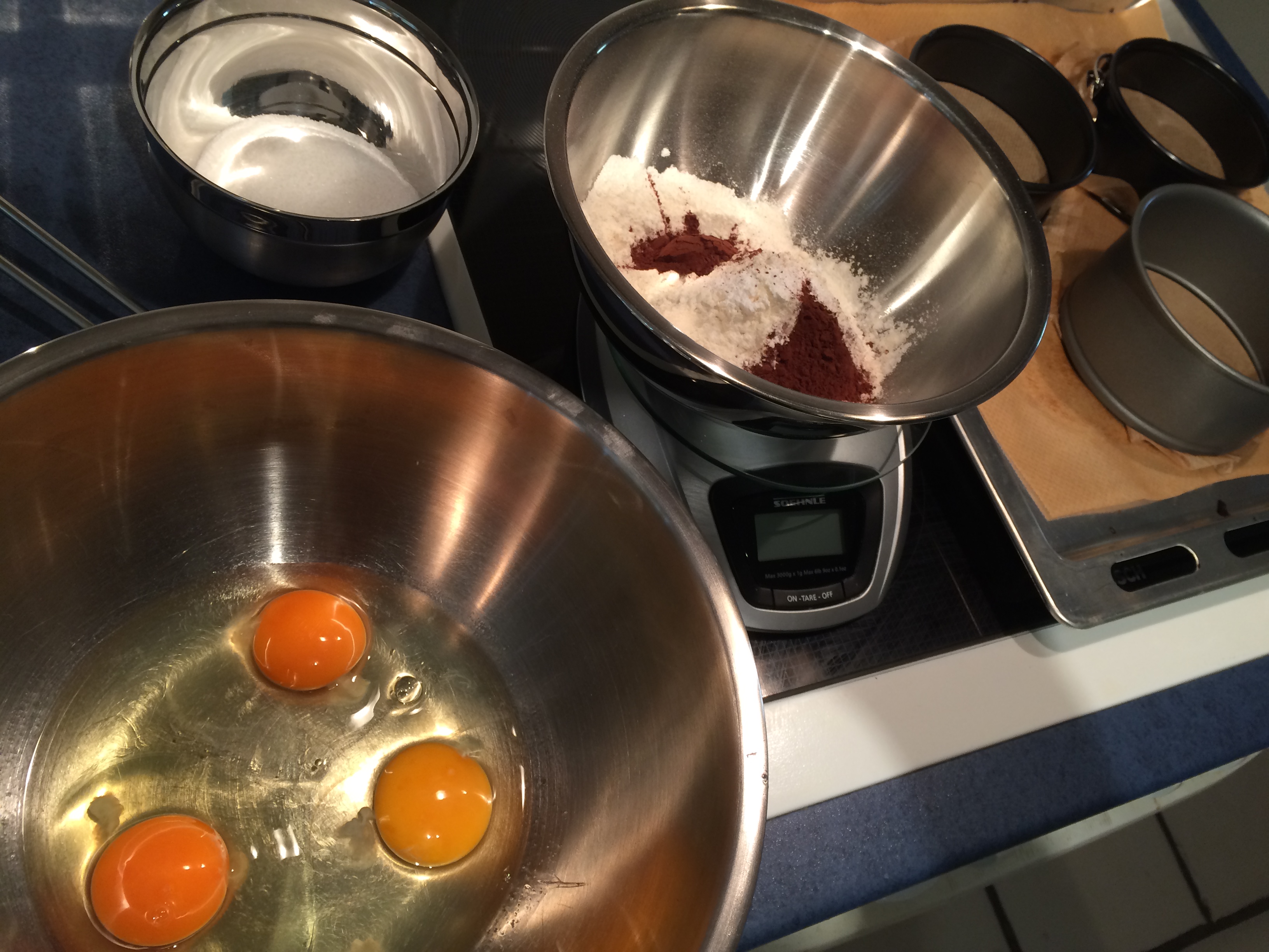 Kleine Planänderung – morgen ist der 01. Mai 2015 und der Feiertag wird bei mir jetzt doch genutzt, um den krönenden Abschluss der Torte Probe zu backen. Geplant ist für die kleinste der drei Torten ein Schoko-Biskuit mit einer Eierlikör-Sahne-Füllung und einer Ganache aus weißer Schokolade. Ich MUSS diese kleinen süßen Springformen (naja – eigentlich Springförmchen) einfach in der Praxis testen. Dann hätte ich auch alle drei geplanten Torten ein Mal erfolgreich und schmackhaft Probe gebacken. Sofern das mit der kleinen Torte jetzt klappt. Dann könnte ich mich wirklich etwas zurück lehnen. Doch wie ich mich kenne, fällt mir in den letzten Tagen vor der Hochzeit – am Besten so ein bis zwei Tage vorher – noch etwas gaaaaanz Tolles ein, das unbedingt mit in die Torte eingearbeitet werden muss. Oder vielleicht sollte ich doch eine vierstöckige Torte machen…jetzt wo ich ja DER Profi für dreistöckige bin. Nein – ich muss dankbar sein, dass es bis hierher gut geklappt hat – nur kein Risiko mehr eingehen.