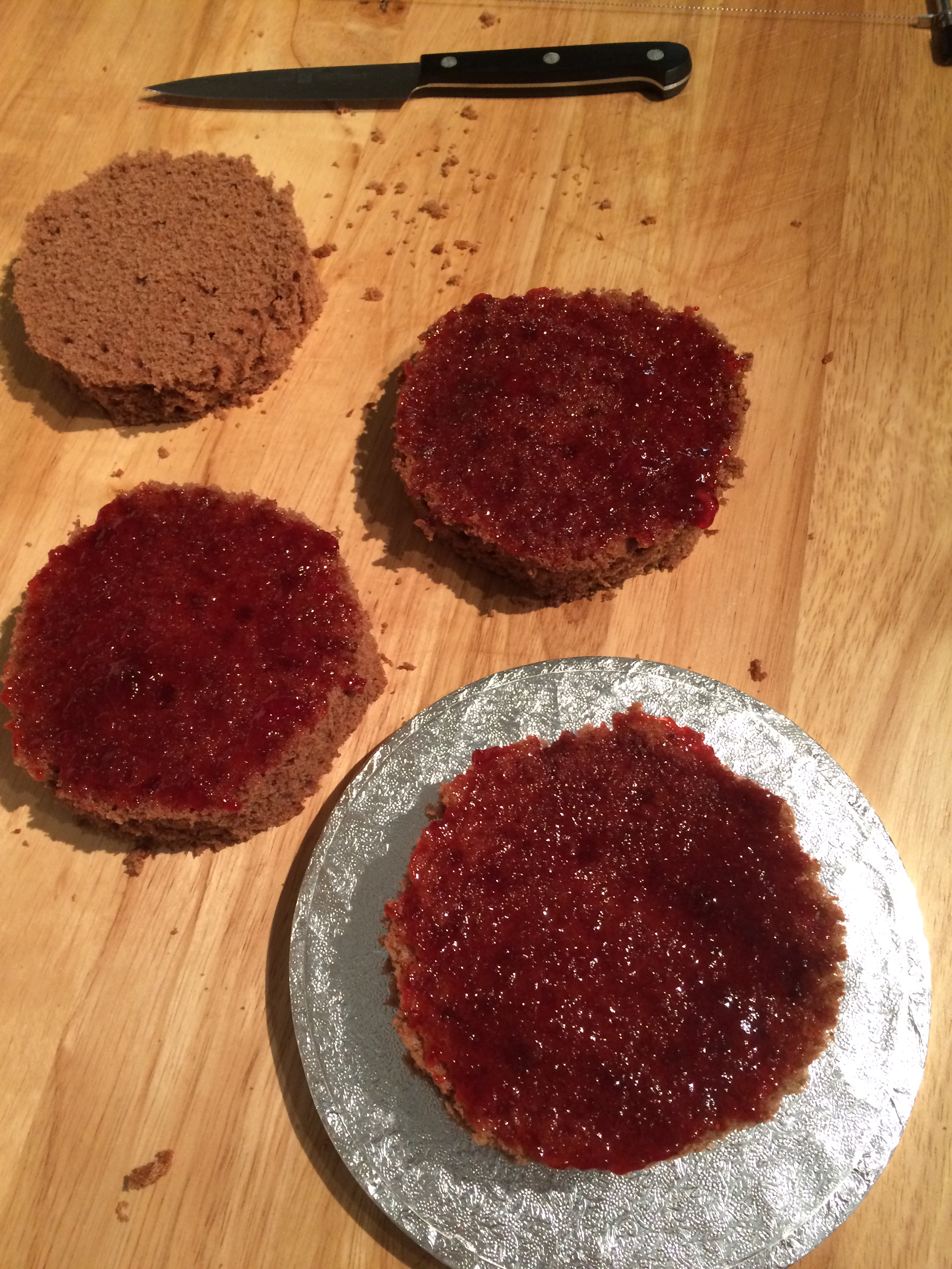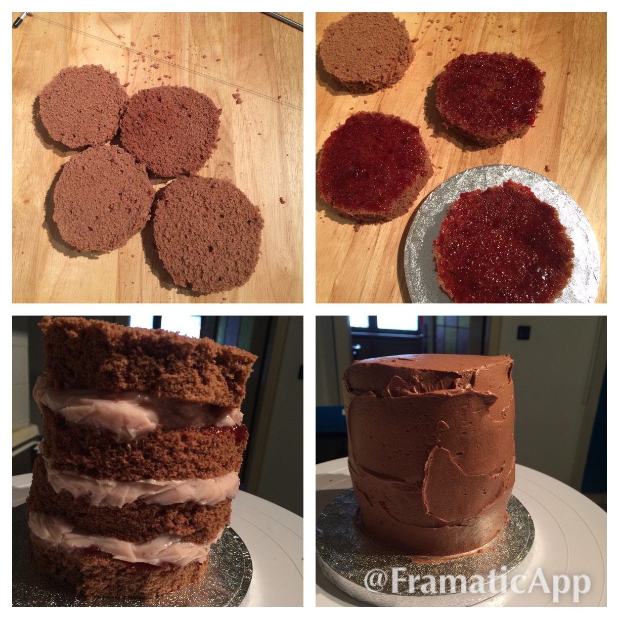 Das Ergebnis des Test-Wochenendes ist äußerst zufriedenstellend. Ermittelt wurde der Gewinner für den mittleren Kuchen. Hierfür habe ich zwei 18 cm Biskuitböden gebacken. Nach einer Nacht im Kühlschrank habe ich die Böden angeglichen und schön gerade geschnitten und geteilt. Dazu testete ich eine Himbeer-Sahne-Füllung. Und als Mantel gab es eine Zartbitter-Ganache. Dieses Mal verzichtete ich auf das Einschlagen mit Fondant und so bekamen die Testesser eine etwas weniger süße Torte zum Probieren. Wie schon erwähnt schmeckte die Torte allen und wurde für gut befunden. Jetzt sehe ich erst Recht dem eigentlichen Back-Termin etwas gelassener entgegen und kann mich tatsächlich etwas mehr und intensiver um die Dekoration kümmern. Für das nächste Wochenende lege ich erst einmal eine Pause ein – schließlich habe ich am 02. Mai Geburtstag – den möchte ich weniger mit Backen verbringen 🙂 Und dann ist ja auch schon bald das eigentliche Ereignis – meine Güte – ich bin so gespannt.
