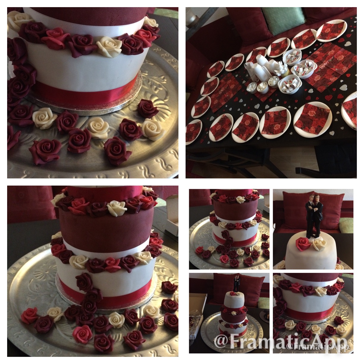 Aktueller Plan nach diesem Wochenende: Untere Torte – Vanillekuchen 24cm mit Marmeladeschichten – überzogen mit Vollmilch-Ganache und weißem Fondant. Mittlere Torte – Schokobiskuit 18cm mit Erdbeer-Quark – überzogen mit Vollmilch-Ganache und rotem Fondant. Obere Torte – Biskuit 12cm mit Himbeersahne – überzogen mit Vollmilch-Ganache und weißem Fondant. Gekrönt wird alles mit einem Bräutigam-Paar. Damit die Schnittstelle ordentlich aussieht möchte ich Satinbänder als Kuchenabschluss. Dazu habe ich noch Marzipanrosen – 36 Stück. Die wollen auch auf die Torte.