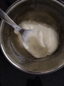 Gelatine-Blätter auswringen und leicht erwärmen. Ist sie geschmolzen, zum Angleichen einen Esslöffel der Frischkäse-Joghurt-Masse hinzugeben und gut vermischen. Dann schnell unter die Masse mit einem Schneebesen einarbeiten.