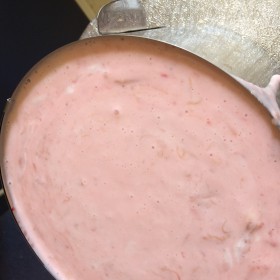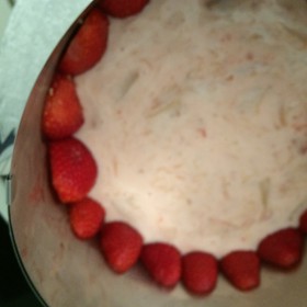 Als kleine Abwechslung habe ich noch ein paar Erdbeeren halbiert und vor dem Einfüllen der Creme am Rand aufgestellt.