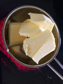 Zuerst von der Zitrone die Schale abreiben und danach den Saft auspressen. Die Butter bei niedriger Temperatur schmelzen und auf der Seite abkühlen lassen