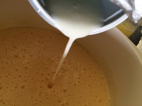 Danach auf kleiner Stufe die Buttermilch den Abrieb und 60 ml Zitronensaft dazu geben.