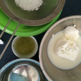 Für die Füllung legt ihr zuerst die Gelatine in Wasser ein. Dann in einer Schüssel den Quark und die Buttermilch mit dem Handmixer zu einer glatten Masse verrühren. Danach den Limettenabrieb und –saft mit dem Mixer einarbeiten. Zum Schluss den Puderzucker darüber sieben, mit dem Mixer einarbeiten und zur Seite stellen.