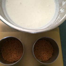 Die Butter in einem kleinen Topf bei schwacher Hitze schmelzen und leicht abkühlen lassen. In einer Küchenmaschine die Kekse zerkleinern (wahlweise nehmt ihr einen Gefrierbeutel und ein Wellholz). In einer Schüssel die Krümel mit der noch flüssigen, leicht abgekühlten Butter mit einem Löffel vermischen, bis ihr die Konsistenz von nassem Sand habt. Verteilt die Masse gleichmäßig auf die vorbereiteten Dessertringe und drückt sie fest. Entweder mit einem kleinen Löffel oder mit dem so genannten Stempel (war bei mir bei den Dessertringen mit dabei).