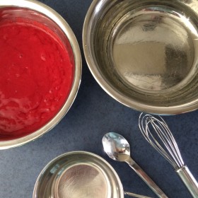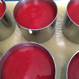 Für den Fruchtspiegel auch hier zuerst die Gelatine einweichen. Dann püriert und passiert ihr Himbeeren durch ein Sieb, bis ihr 300 gr. Fruchtsoße habt. Wieder die Gelatine vorsichtig schmelzen, mit etwas Himbeersoße angleichen und dann erst zum Rest der Soße geben und wieder sehr gut verrühren. Jetzt kann die Himbeersoße in die schon etwas gekühlten Ringe mit der schon etwas angedickten Creme-Masse gegeben werden.