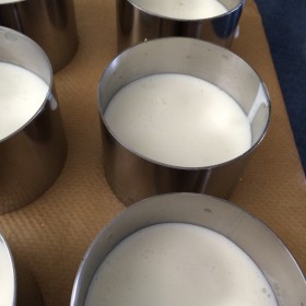 Die Gelatineblätter gut ausdrücken und bei schwacher (wirklich schwacher) Hitze in einem kleinen Töpfchen schmelzen – bei meinem Herd stelle ich die kleinste Platte auf die kleinste Stufe. Ist sie geschmolzen gebt ihr zwei Esslöffel der Masse dazu und rührt weiter. Habt ihr einen homogenen Gelatine/Quark-Mix könnt ihr ihn unter die restliche Masse geben und mit einem Schneebesen sehr gut verrühren. Somit stellt ihr sicher, dass die Gelatine keinen Schock bekommt und Fäden zieht und dass sie sich gleichmäßig in der Masse verteilt und es später keine festen und wabbeligen Stellen gibt. Füllt die Masse in die Ringe und lasst oben mindestens 1 cm Platz für den folgenden Fruchtspiegel.