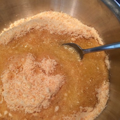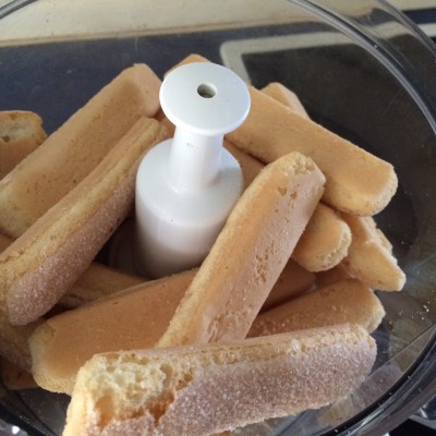 Zuerst die Butter bei niedriger Temperatur schmelzen zu zur Seite stellen. Dann die Löffelbiskuit zerkleinern – entweder mit der Küchenmaschine oder mit reiner Muskelkraft und einem Nudelholz.