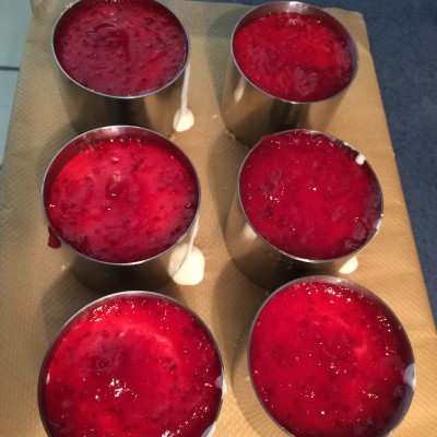Die Ringe dann nochmals für ca. 15 Minuten in den Kühlschrank. So kann die Masse kurz anziehen, bevor ihr als Abschluss die Marmelade darüber gebt. Ich habe die Marmelade in einem kleinen Töpfchen erhitzt – so kann man sie besser verteilen.