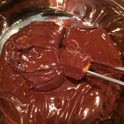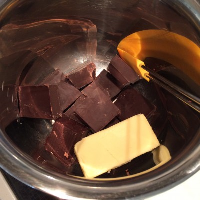 Die Schokolade zusammen mit der Butter schmelzen. Auch zur Seite stellen und etwas abkühlen lassen.