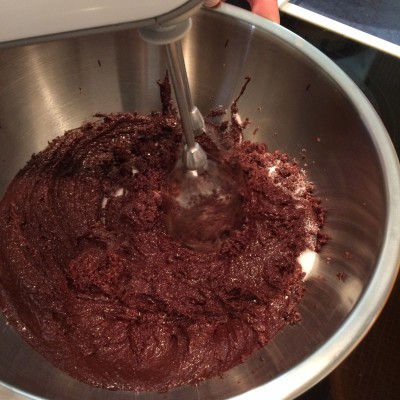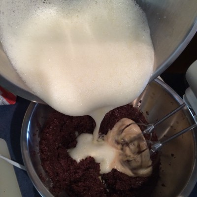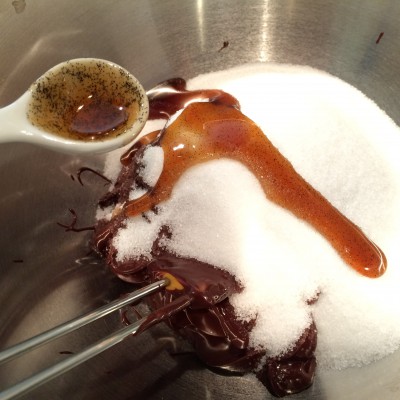 In einer großen Schüssel die geschmolzene Schokolade mit 175 gr. Zucker und der Vanille mit dem Handmixer aufschlagen.
