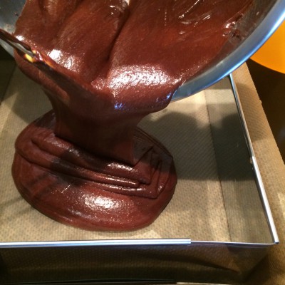 Die Schokoladenmasse in den Backrahmen (oder Backform) geben und glatt streichen.