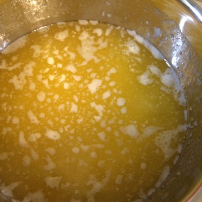 Zuerst in einem Topf bei kleiner Hitze die Butter schmelzen und auf der Seite leicht abkühlen lassen.