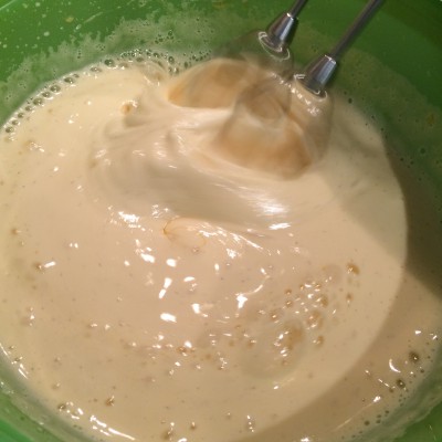 Sauerrahm und die geschmolzene und leicht abgekühlte Butter dazu geben und weiter mixen.