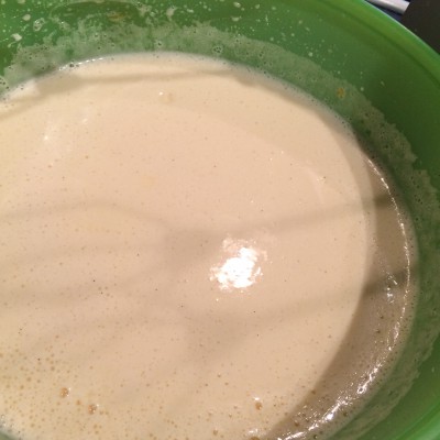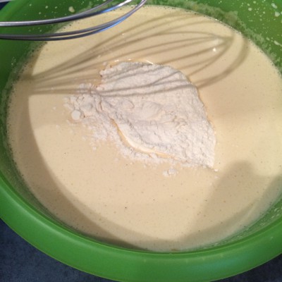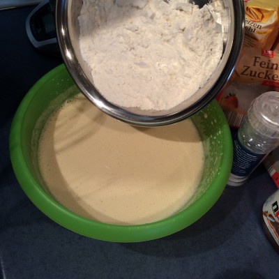 Am Ende das Mehl mit dem Backpulver gut vermischen und mit dem Schneebesen vorsichtig unter die Masse heben.