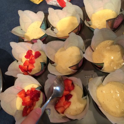 Die Förmchen zu 3/4 füllen, mit Erdbeerstückchen belegen und für 30 Minuten in den auf 180°C vorgeheizten Backofen geben.