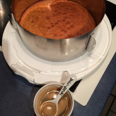 Den Kuchen auf eine Tortenplatte setzen und die oberste Schicht waagrecht mit einem langen Messer abtrennen. Insgesamt nur ein paar Millimeter, so lässt er sich besser Tränken. Amaretto und Espresso mischen und den Kuchen damit beträufeln.