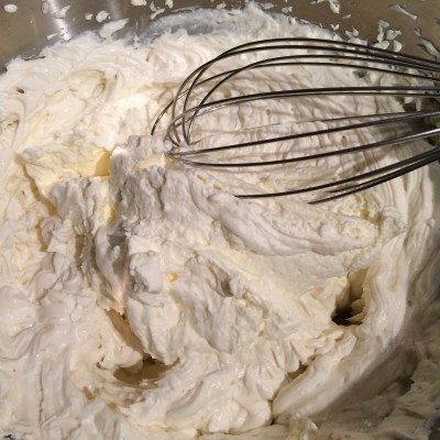 Für die Creme Mascarpone, Quark, Zucker und Vanillezucker glatt rühren. Sahne mit dem Festiger steif schlagen und unter die Mascarponecreme heben.