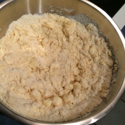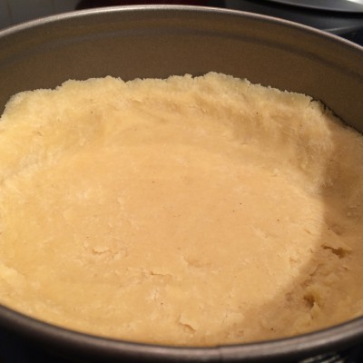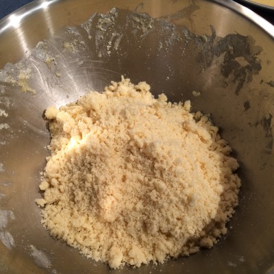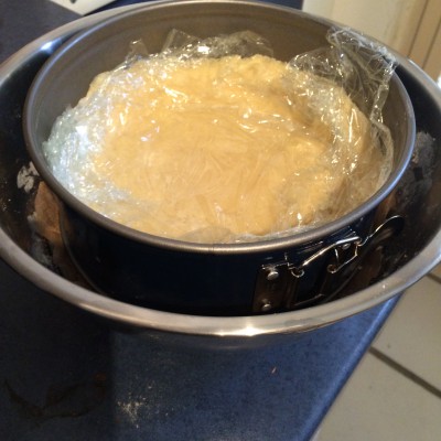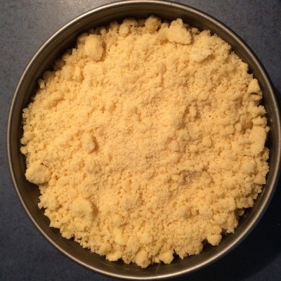 Am Anfang habe ich mit den Knethaken des Mixers gearbeitet, bis ich Streusel hatte. Dann habe ich die Hälfte in die Springform gegeben und fest gedrückt. Dabei einen kleinen Rand hoch gezogen. Den Rest als Streusel einfach in der Schüssel gelassen. Beides habe ich dann mit Frischhaltefolie abgedeckt und für 30 Minuten im Kühlschrank ruhen lassen.