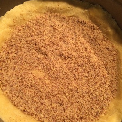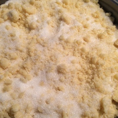 Nach der Ruhephase den Boden mit gemahlenen Mandeln bedecken (eine Handvoll) und das Mus darauf geben. Darauf dann die Streusel locker verteilen und mit etwas Zucker (optional) bestreuen.