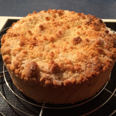 Für 50 Minuten bei 170 °C Ober-/Unterhitze backen. Wie gesagt – das gilt für die 20 cm Springform. Wenn die Streusel schön gebräunt sind ist er fertig. Gut auskühlen lassen und genießen.