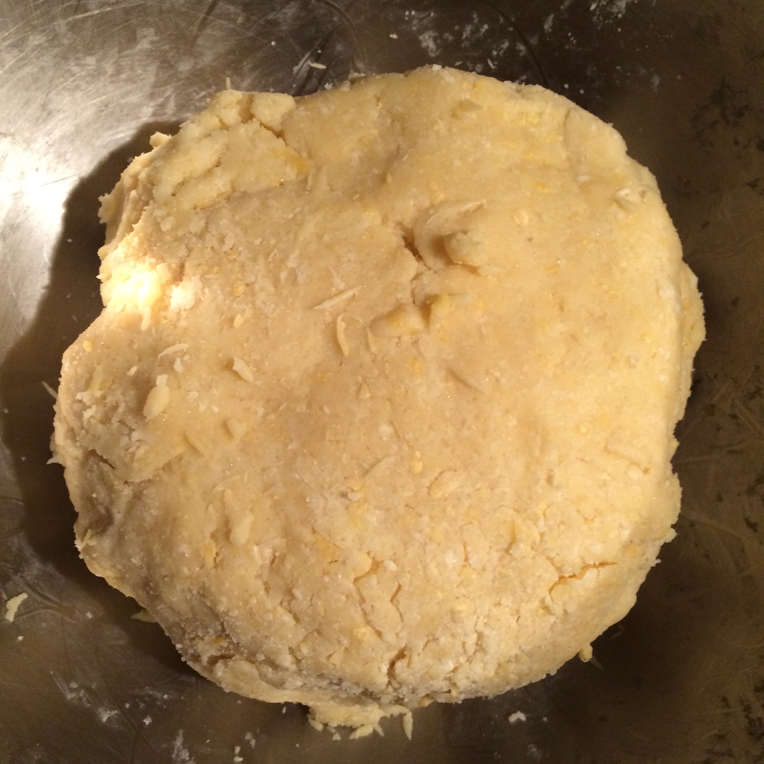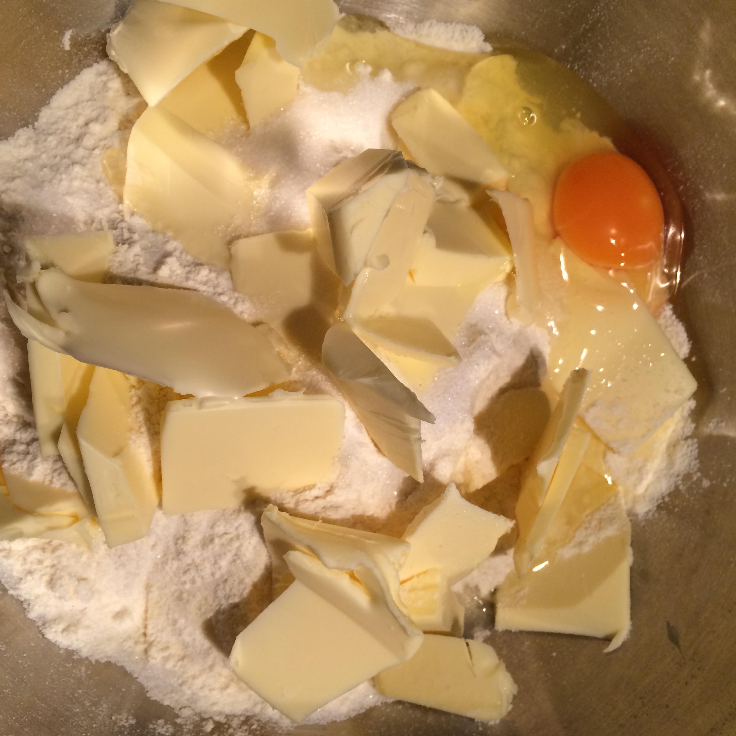 Zuerst aus den Zutaten für den Teig schnell einen Mürbeteig herstellen und in Frischhaltefolie eingepackt im Kühlschrank ruhen lassen. Dazu die Zutaten mit den Händen verkneten bis ihr eine Teigkugel habt. Das sollte relativ zügig gehen, da man einen Mürbeteig nicht zu lange kneten sollte.