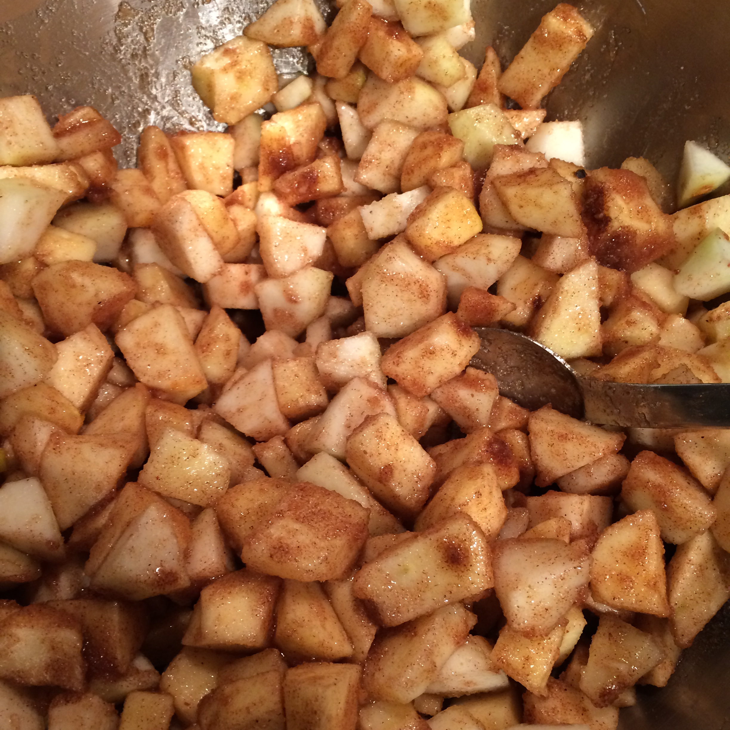 Ich habe die klein geschnittenen Früchte gleich in eine Schüssel mit der Zucker-Zimt-Mischung gegeben. Ungefähr bei der Hälfte dann noch den Zitronensaft hinzu gegeben. Und immer schön unterheben.