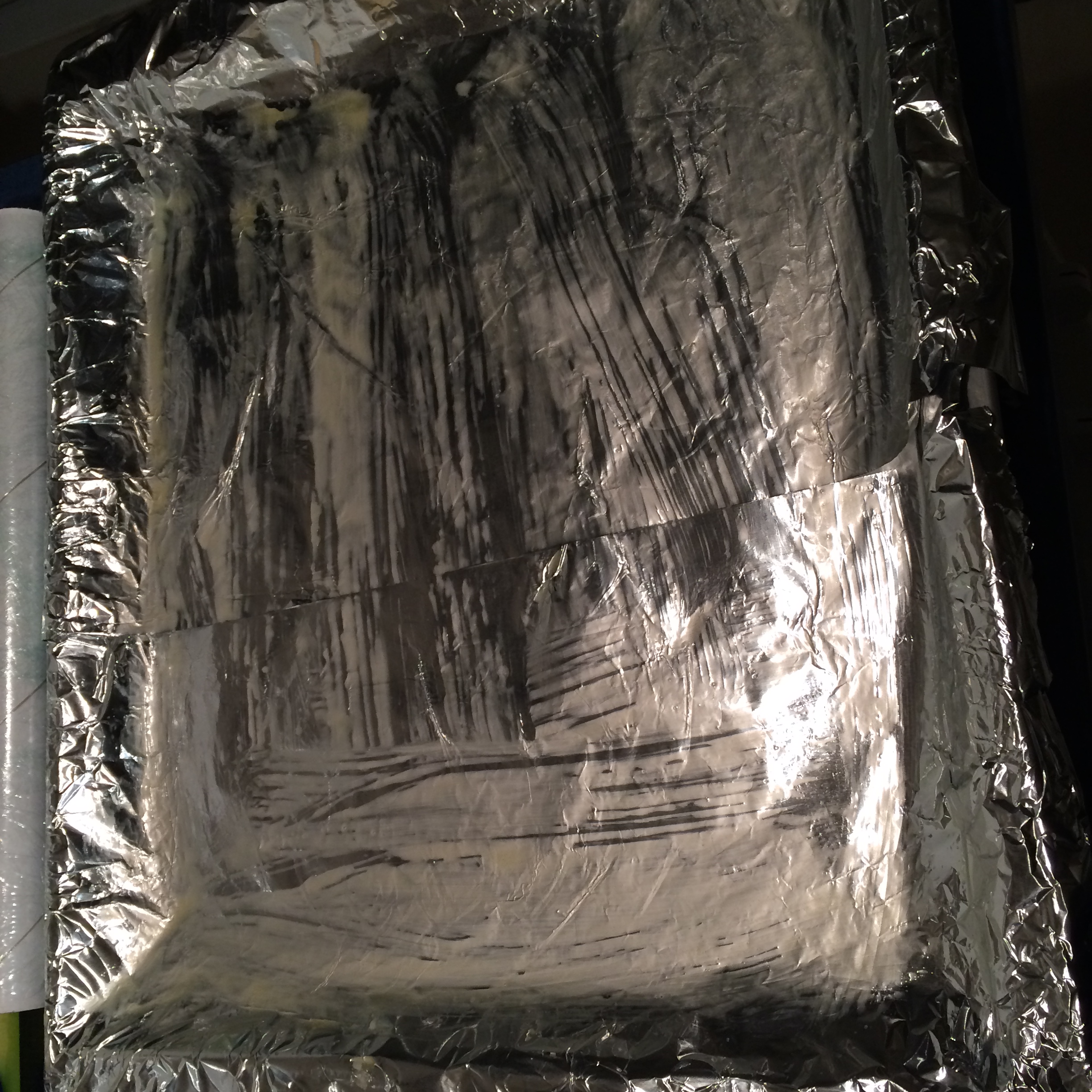 1 Backblech komplett mit Alufolie eingeschlagen und etwas flüssiger Butter eingestrichen