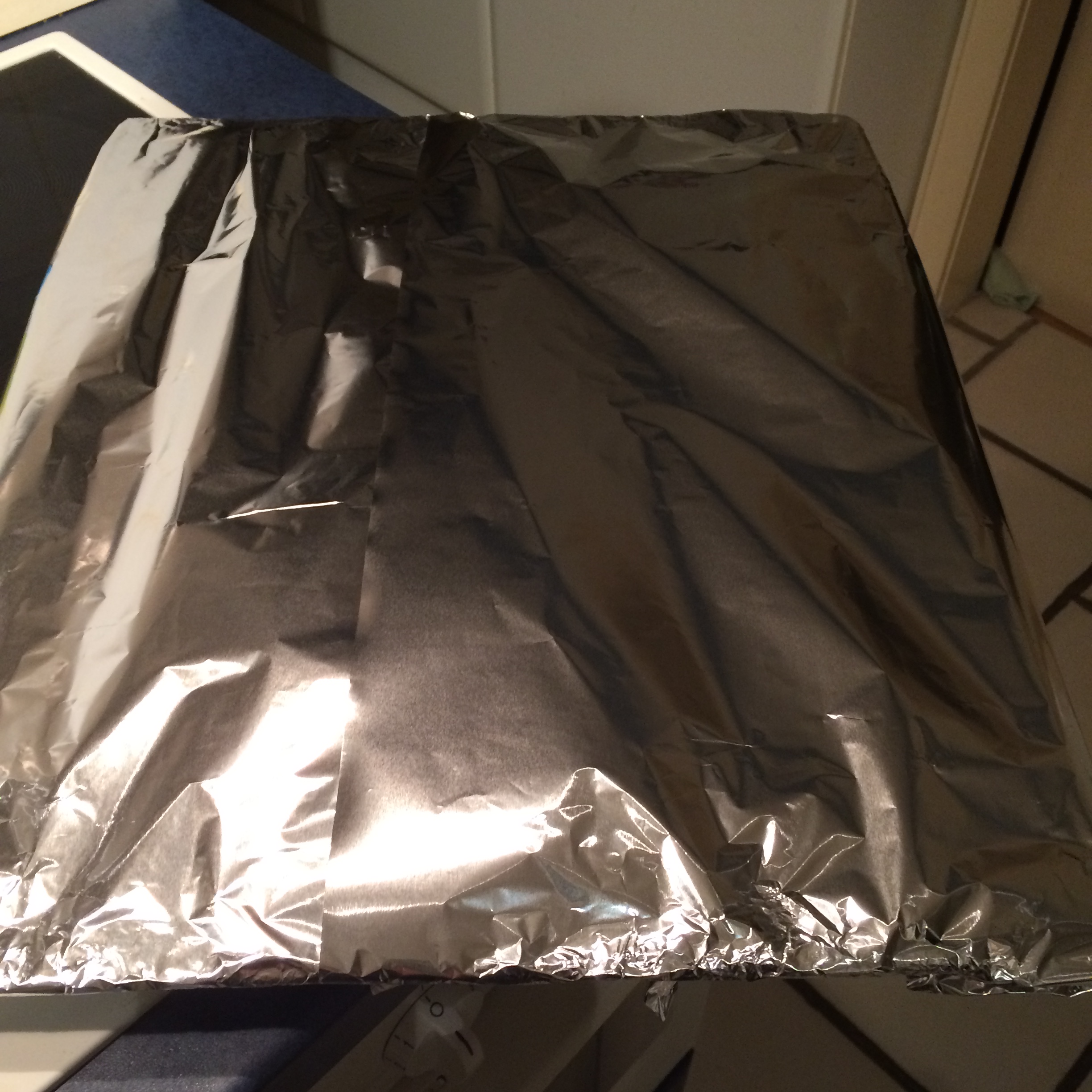 Diese Mischung dann auf das Backblech geben, erneut mit Alufolie abdecken, und für 25 Minuten im Backofen backen.