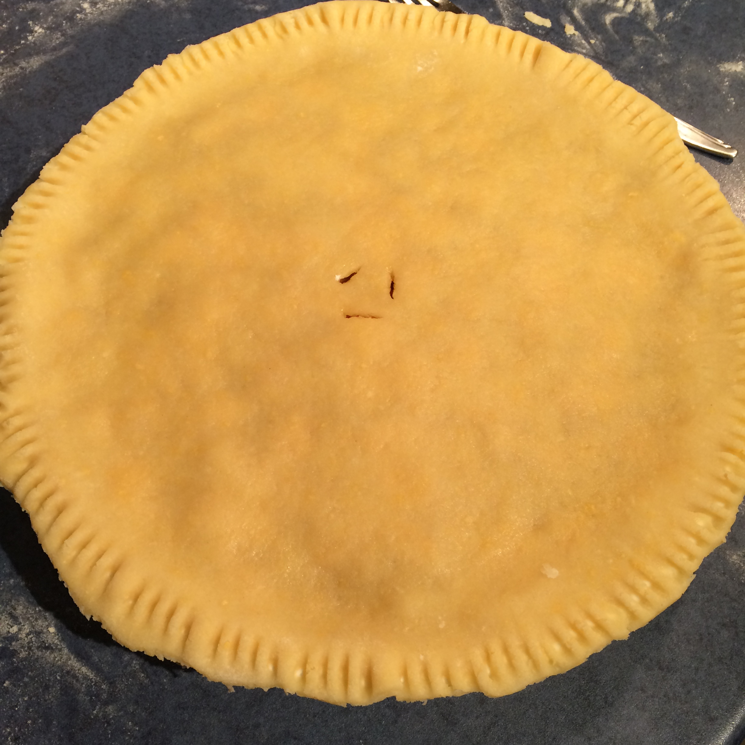 Dann den Deckel darauf legen und mit einer Gabel die Ränder zusammen drücken. Überschüssigen Teig abschneiden und drei kleine Schnitte in die Mitte machen, damit Dampf entweichen kann.