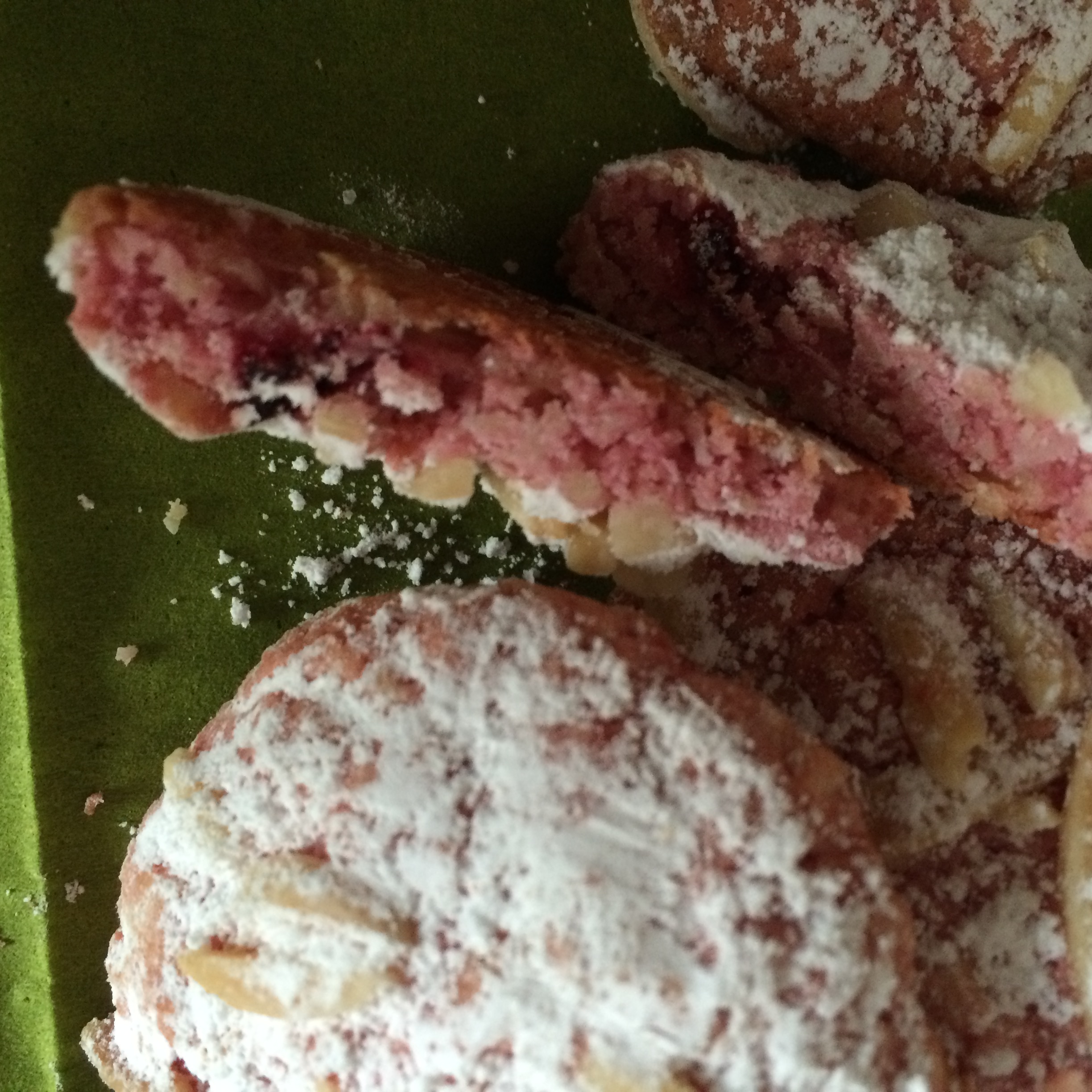 Als Dekorationsabschluss noch etwas Fruchtpulver darüber streuen und die Mandelstifte verteilen.