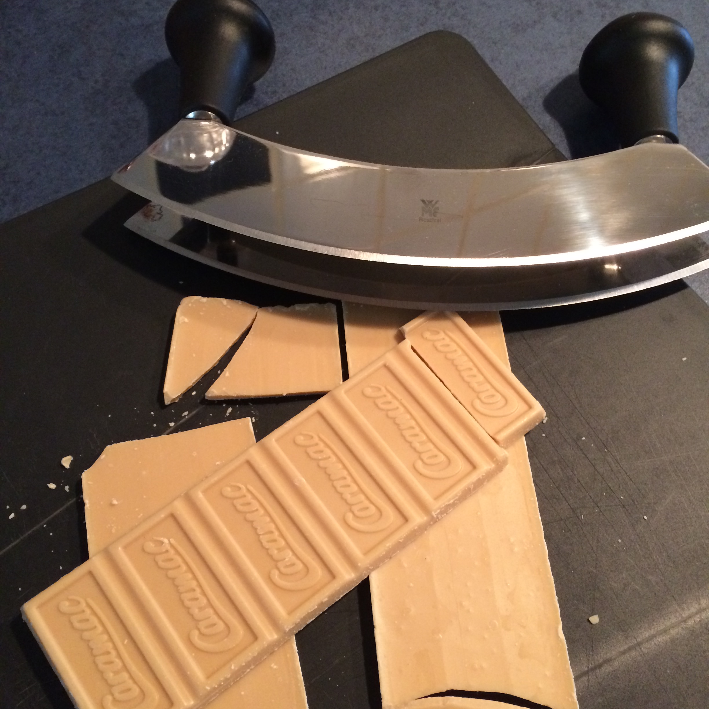 Zuerst die Riegel/Bonbons hacken. Ich habe sehr dünne Riegel gekauft – damit geht es am Besten.