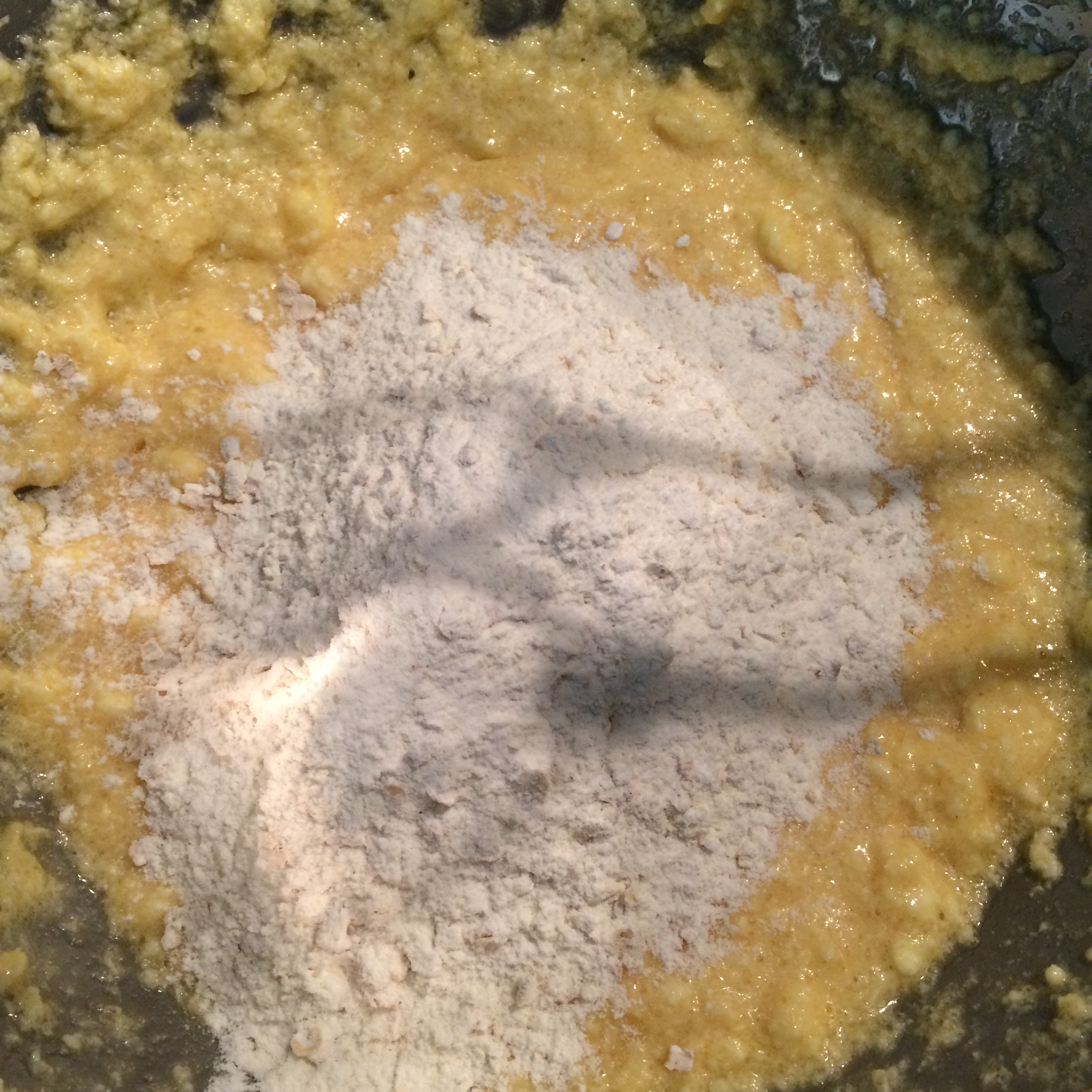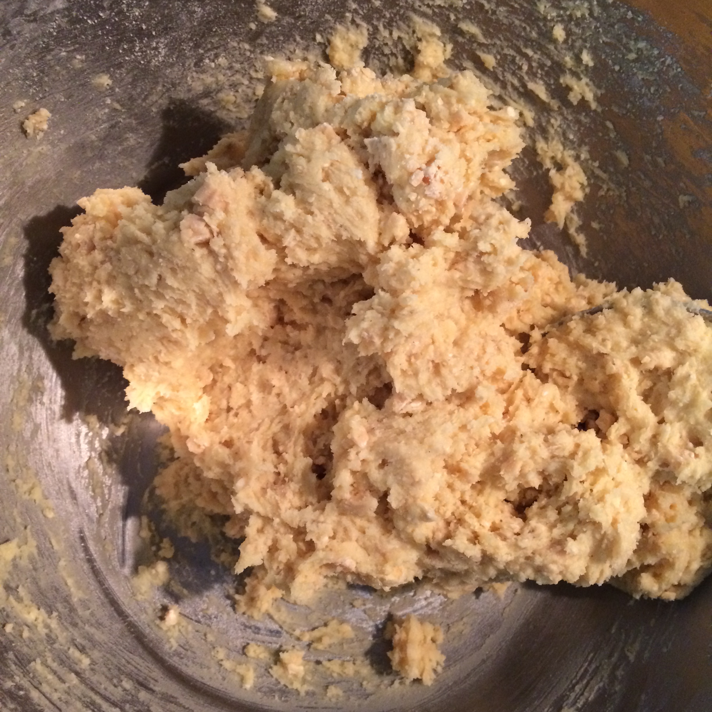 Das Mehl mit den Haferflocken und dem Backpulver vermischen und nach und nach unterheben. Zum Schluss dann den gehackten Karamell.