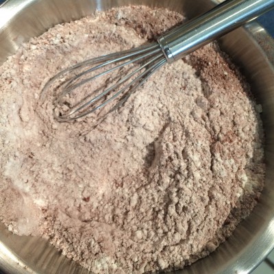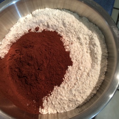 In einer kleinen Schüssel das Mehl mit dem Kakaopulver und dem Backpulver vermischen.