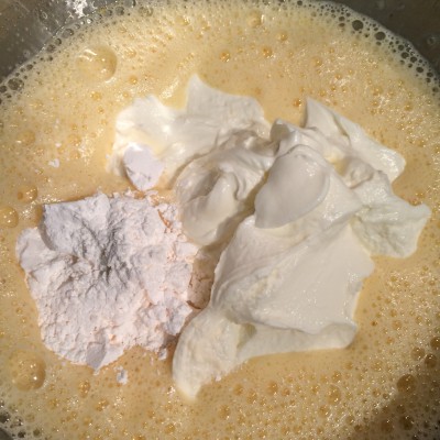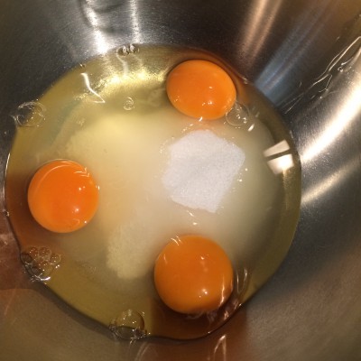 Für die Füllung zuerst die Eier mit dem Zucker und dem Vanillepulver und der Prise Salz schaumig schlagen. Von einer Zitrone den Abrieb und den Saft dazu geben.
