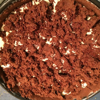 Die Füllung zum Teig geben und den restlichen Teig als Streusel (DAS sind jetzt unsere hergestellten Streusel) darauf verteilen. Als Abschluss noch die zweite Hälfte der Schokostreusel (die gekauften) darüber streuen.