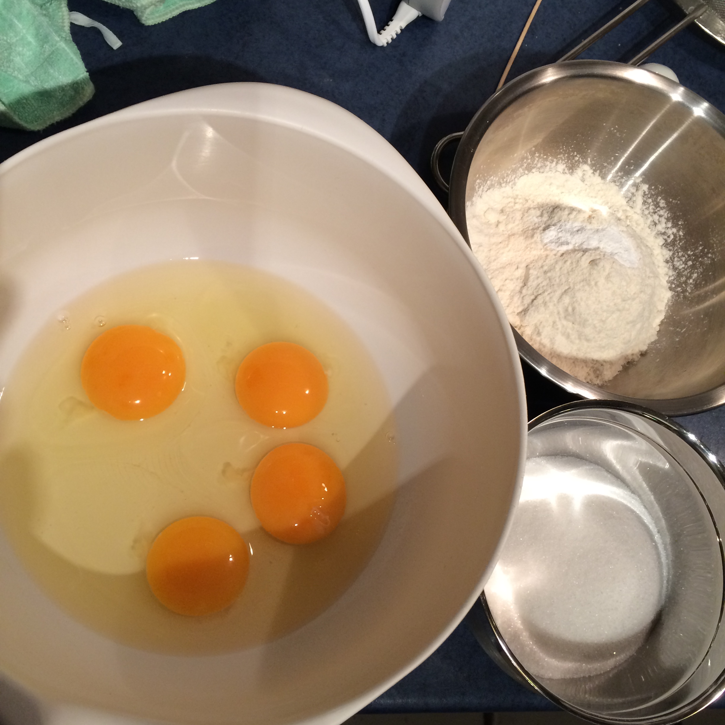 Die Eier mit dem Zucker lange schaumig aufschlagen – das Volumen sollte sich deutlich (dreifach) erhöhen. Das Mehl mit dem Backpulver mischen und darüber sieben. Mit einem Spatel vorsichtig unterheben. Im Ofen bei 180°C für 35-40 Minuten (Stäbchenprobe) backen.