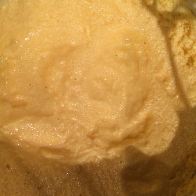 Die Gelatine jetzt ausdrücken und bei sehr niedriger Temperatur zusammen mit dem Apfelsaft schmelzen. Dann alles in die Mischung geben und mit einem Schneebesen gründlich vermischen. Sonst gibt es nachher Stellen, die nicht fest werden.
