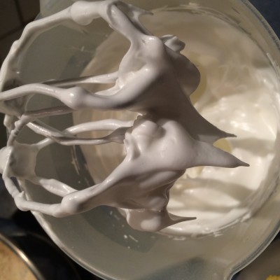 Schlagt die Eiweiß mit dem restlichen Zucker (75 gr.) steif.