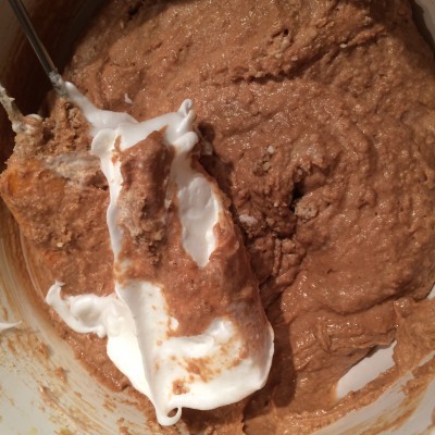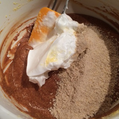 Jetzt könnt ihr mit einem Spatel nach und nach das Mehl/Gewürz-Gemisch und das Eiweiß unterziehen.