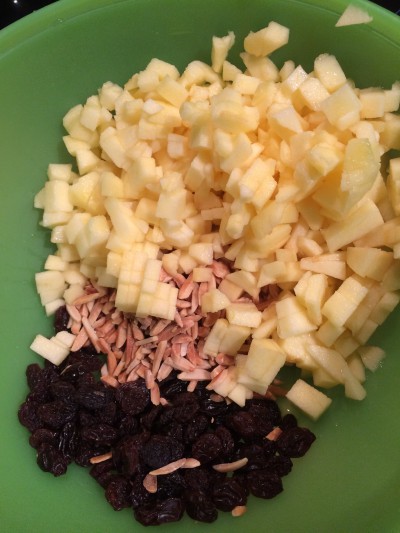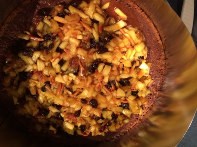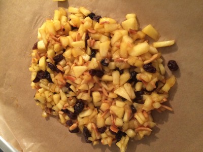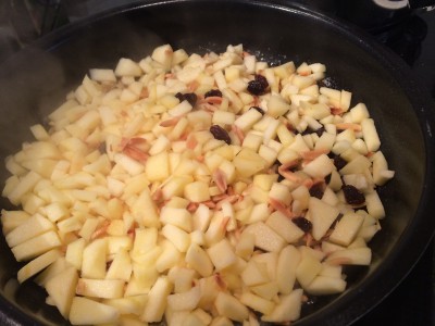 Für die Apfel-Füllung schält, entkernt und würfelt ihr die Äpfel. In einer Pfanne bei mittlerer bis kleiner Hitze schmelzt ihr dann den Zucker. Ist er leicht bräunlich gebt ihr die Äpfel mit den Mandelstiften und den Rosinen dazu. Lasst das Ganze dann schön köcheln – aber natürlich nicht zu dolle. Der karamellisierte Zucker löst sich durch den Saft aus den Äpfeln wieder auf. Alles zusammen sollte eine „schlonzige“ Konsistenz bekommen. Später in der Torte darf nicht so viel Flüssigkeit austreten. Also lieber etwas länger köcheln lassen, bis ihr das Gefühl habt, dass die ganze Flüssigkeit wieder aufgesaugt wurde bzw. verdampft ist. Gebt die Füllung dann auf ein Backpapier zum Abkühlen.